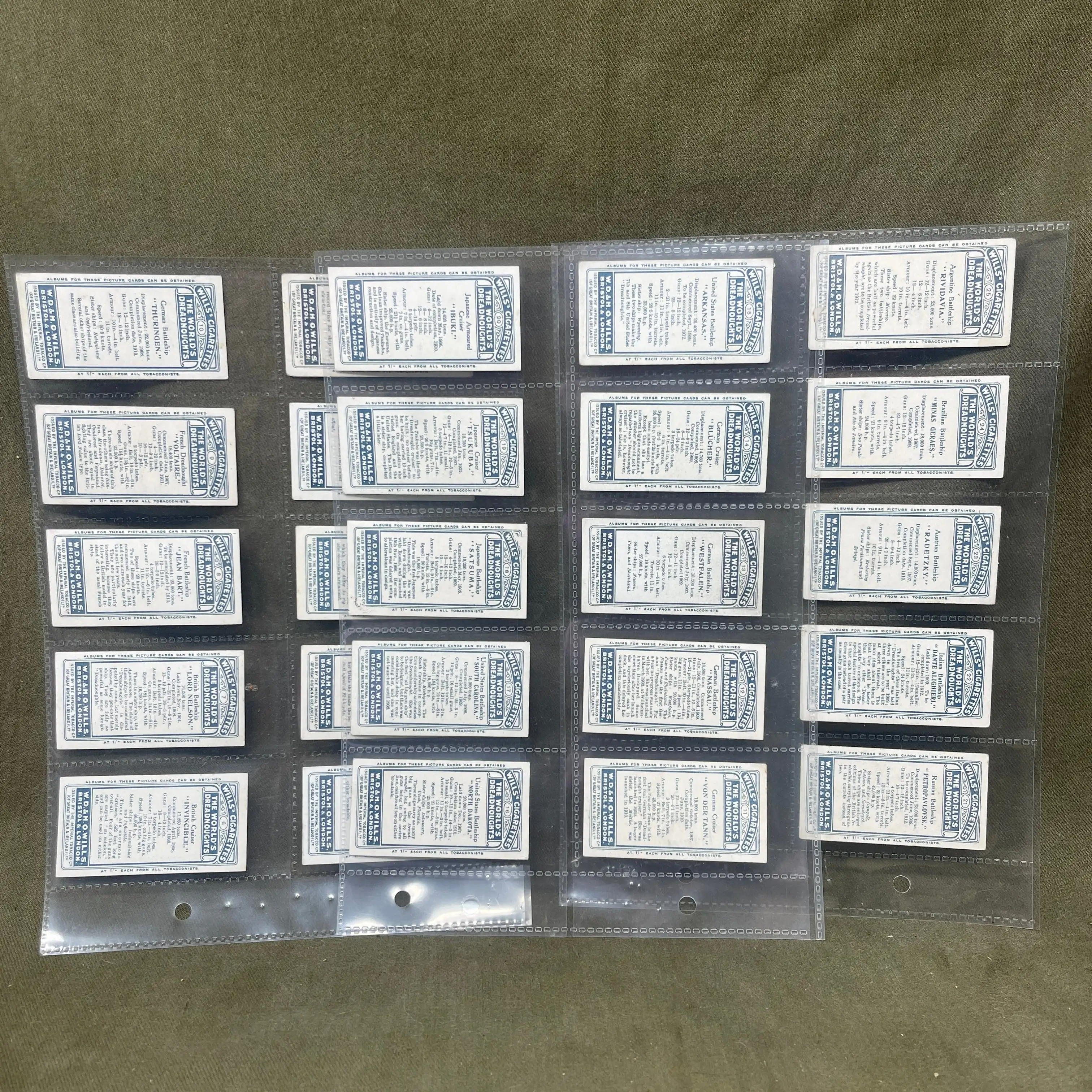 The "Wills's Cigarettes: The World's Dreadnoughts" card series was a highly popular set produced by the British tobacco company W.D. & H.O. Wills in the early 20th century. These collectible cards were part of cigarette packs and featured detailed illustrations of famous battleships, known as dreadnoughts, from various nations around the world. Dreadnoughts were powerful battleships that revolutionized naval warfare in the early 1900s due to their heavy armor and long-range artillery, named after the British HMS Dreadnought, launched in 1906.